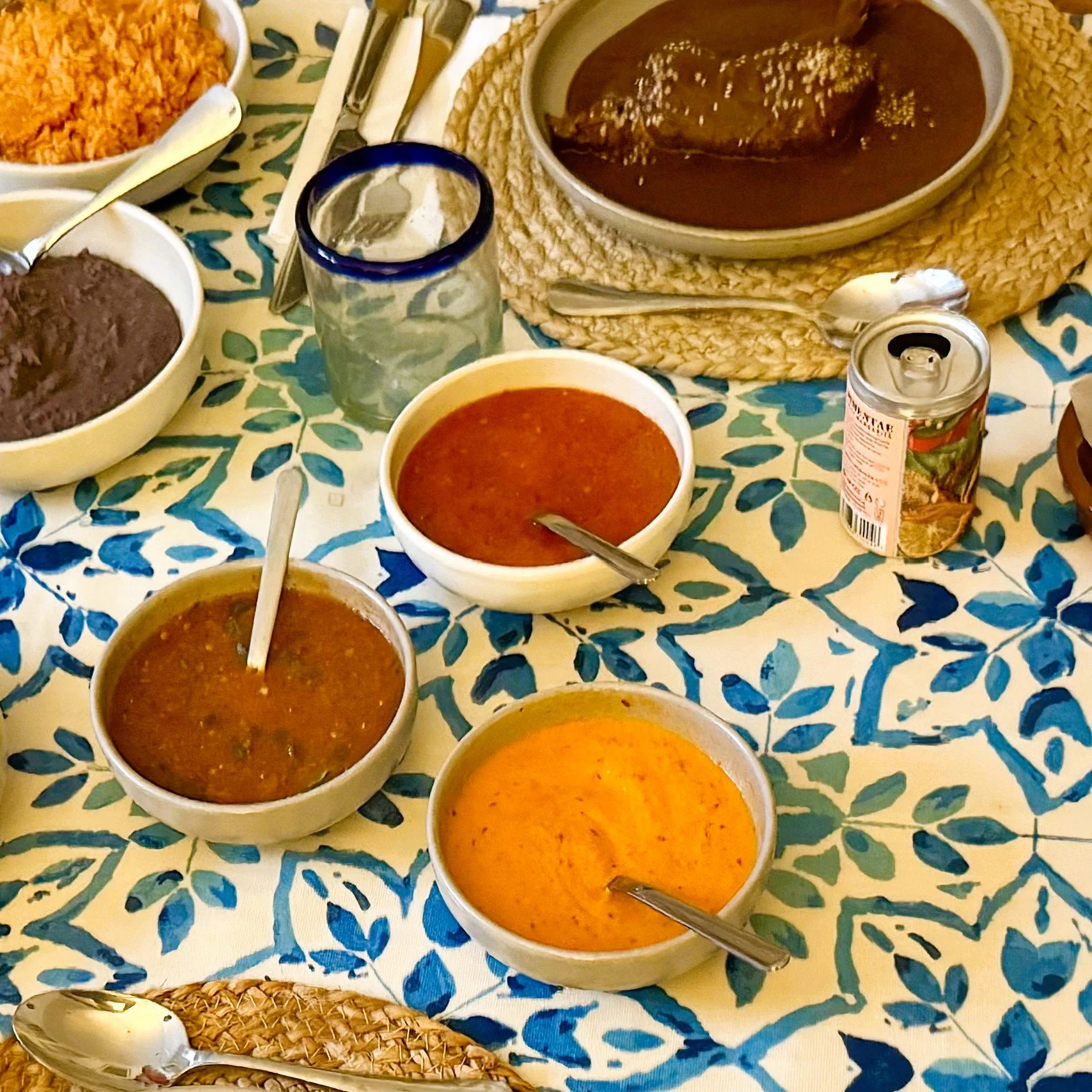 The class made mole chicken, fresh corn tortillas, fried beans, tomato rice, and almost as an aside these three glorious simple salsas that all shared the same four ingredients. The course was great fun - Karla is a warm, engaging teacher and it's upped my mole game something fierce. I'd recommend booking one. But for some reason it’s the salsa not the mole I’ve been obsessed with ever since.