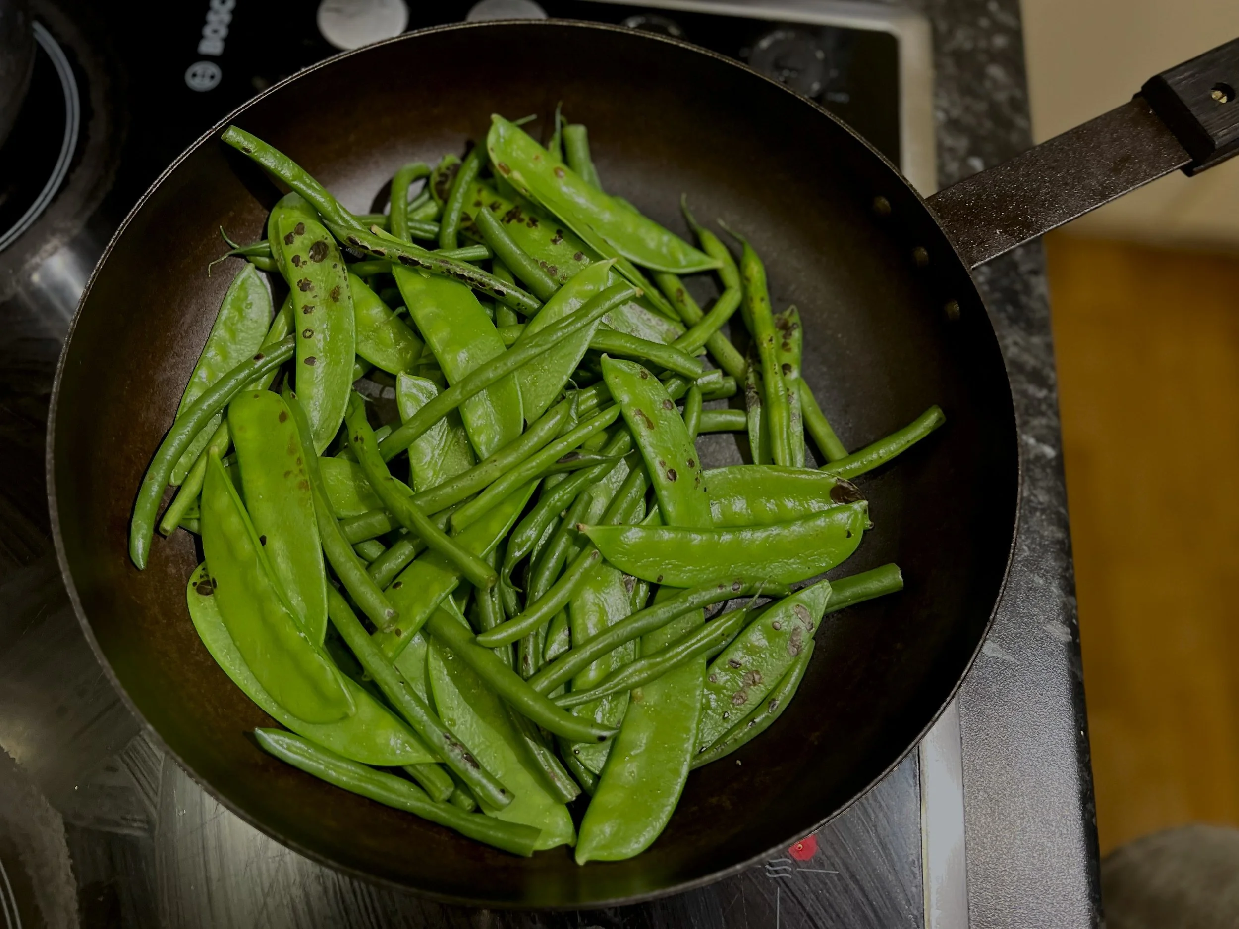 Make sure the beans and mangetout are well drained and pretty dry, and add them to the dry pan. You may need to do this in 2 batches. Add the jalapeño if you’re using it.