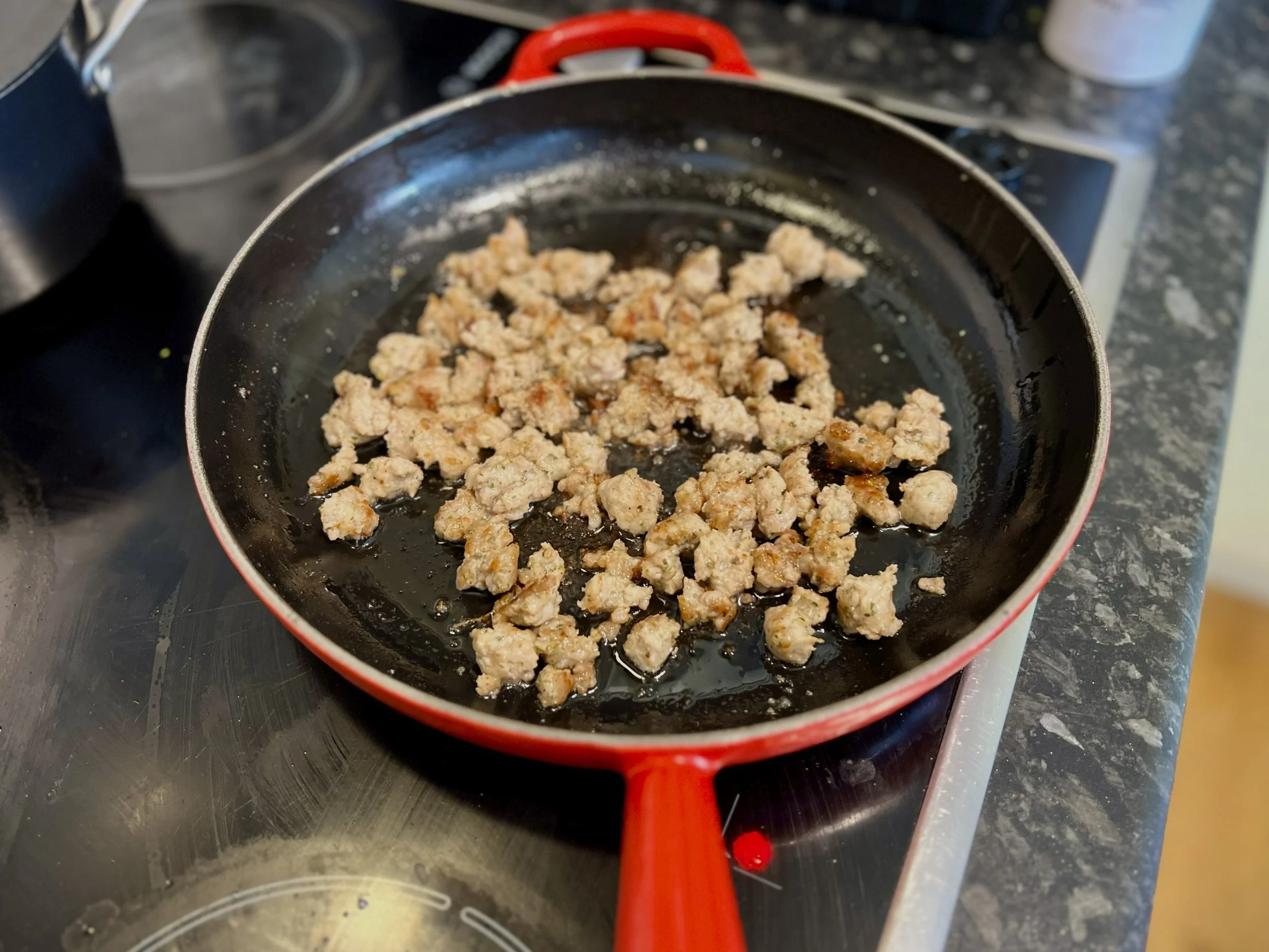 Get a decent sized pan medium hot, add a big splash of (olive) oil. Remove the sausages from their casings, and crumble them into the pan. Fry the sausage meat, stirring occasionally to break up the bigger clumps, for 6-7 minutes, until we’ve got a bit of browning going on.