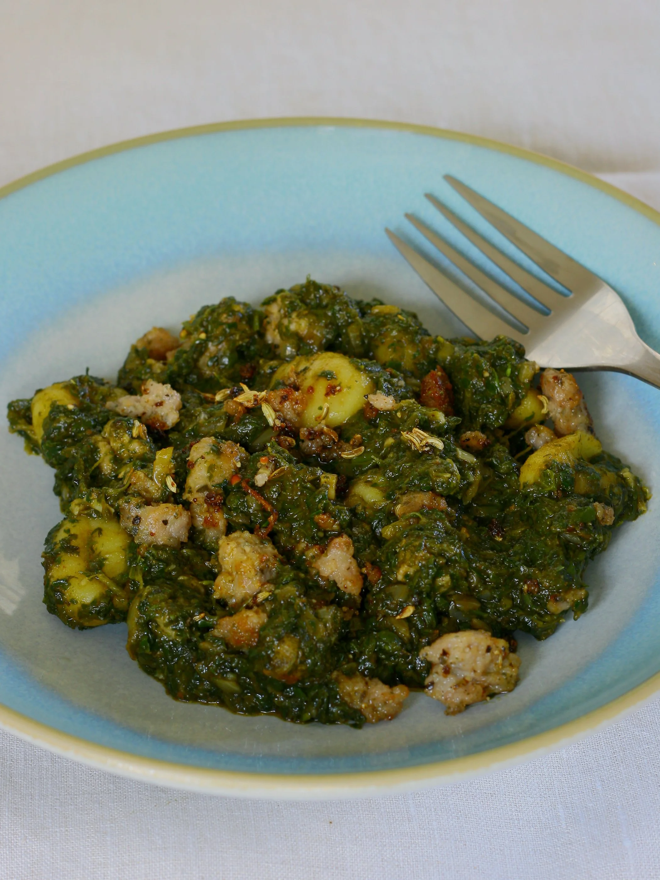Gnocchi in a bkeila-style spinach sauce with sausage