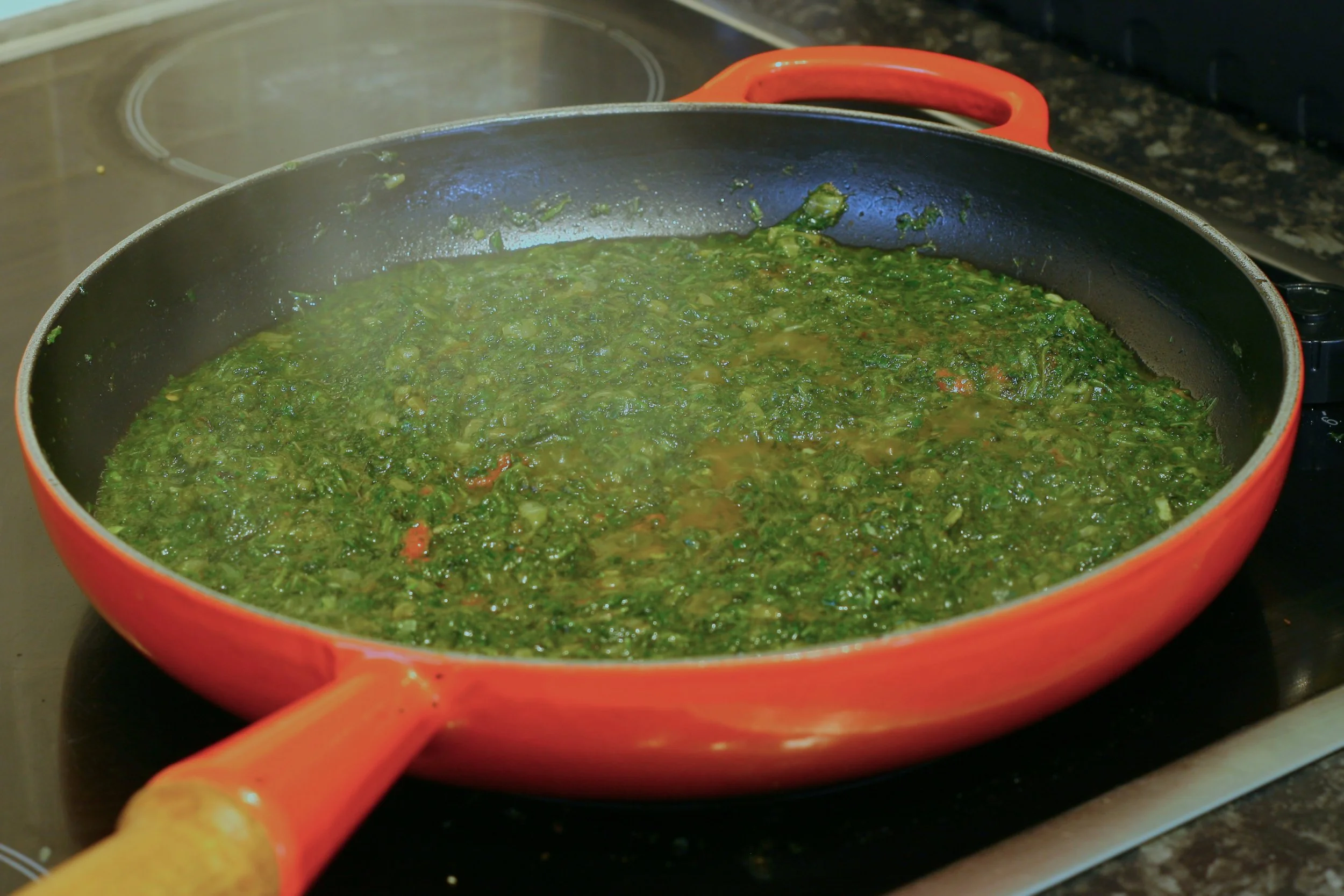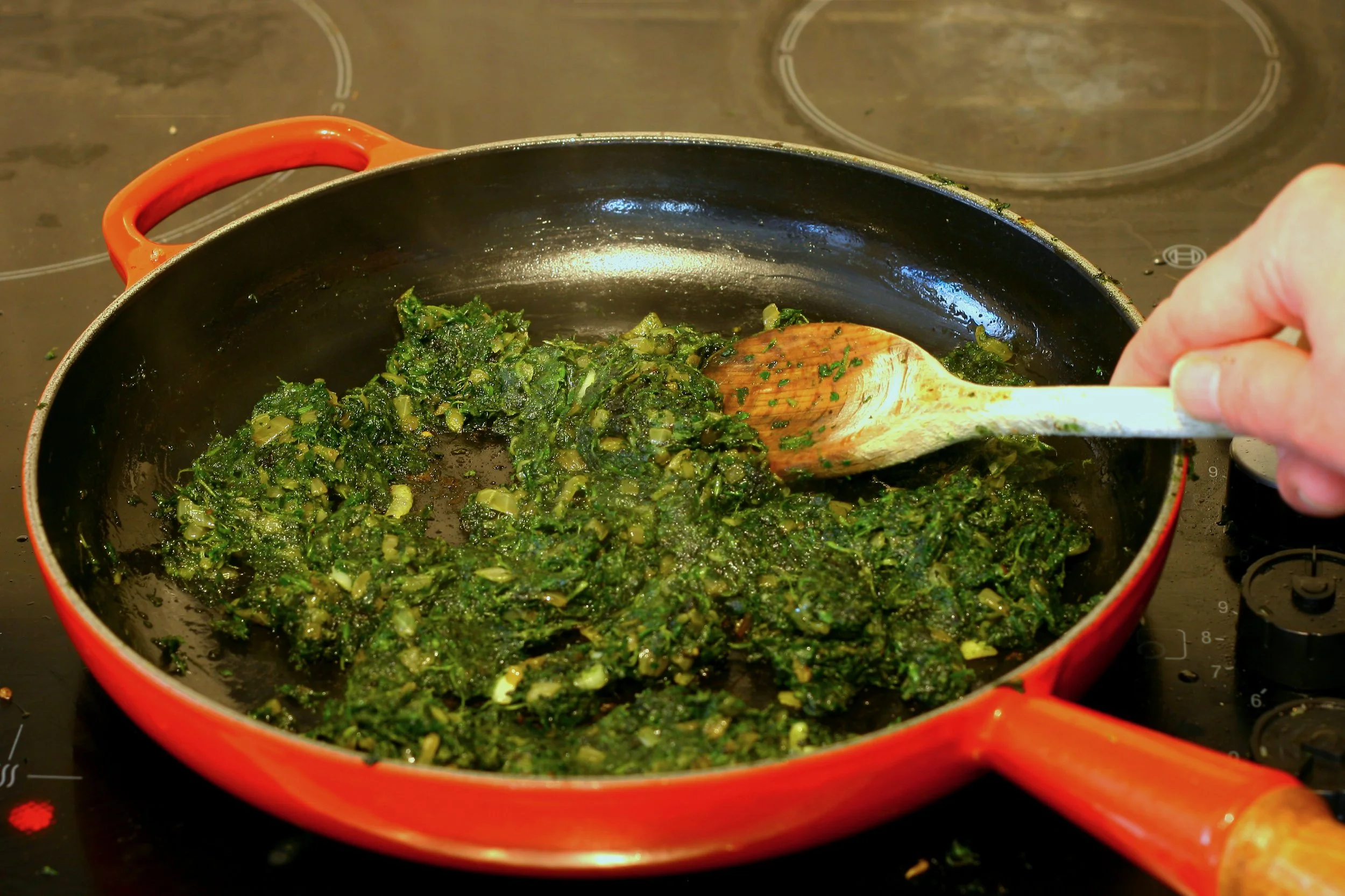 Raise the heat slightly and add the spinach herb paste, and the oregano. You may need a splash more oil. Don't be sheepish - we need this spinach to fry.